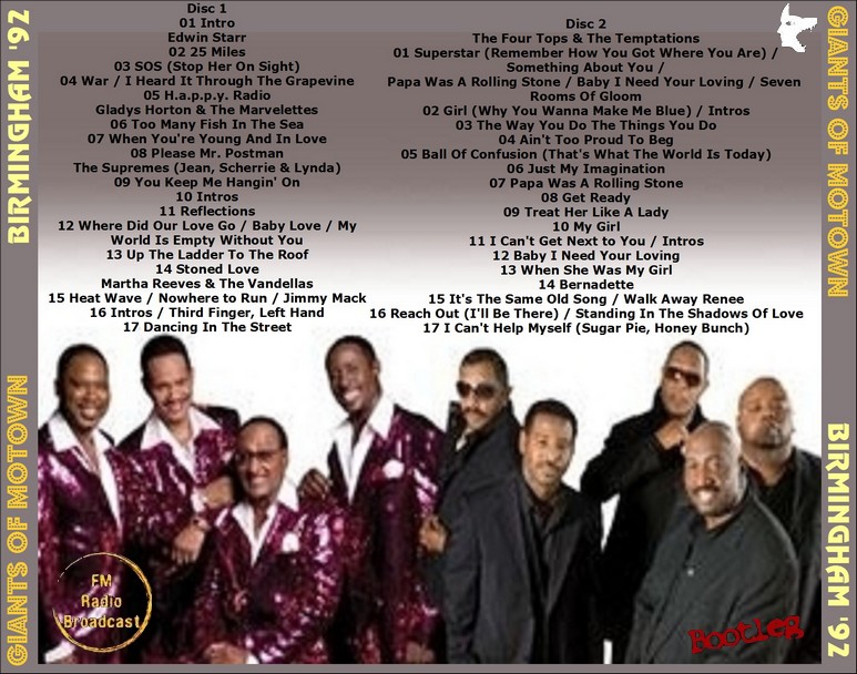 Todays first download is a wicked show that was recorded at the NEC Birmingham in April 1992. This show was part of the Giants Of Motown tour that hit the UK in 1992. It features some of the best known artists of the Tamla Motown label. The line up features : The Four Tops, The Temptations, Martha Reeves & The Vandellas, Edwin Starr, The Supremes & Gladys Horton & The Marvelettes. The quality of this bootleg is superb and the audio has been taken from a BBC FM broadcast. If you like a bit of Motown, grab this one - it's thoroughly recommended.... Here is a download link I found for :- The Giants of Motown, National Exhibition Centre, Birmingham England, April 1992 - Various Artists (Bootleg) Quality : Superb Tracklisting : Disc 1 Edwin Starr Gladys Horton & The Marvelettes The Supremes (Jean, Scherrie & Lynda) Martha Reeves & The Vandellas Disc 2 Download Links : Part 1 : [Link] Filesize : 270MB (Including All Artwork and Tracklisting) The Temptations The Four Tops (all original members) Giants Of Motown: Back Cover : [Link] Enjoy!