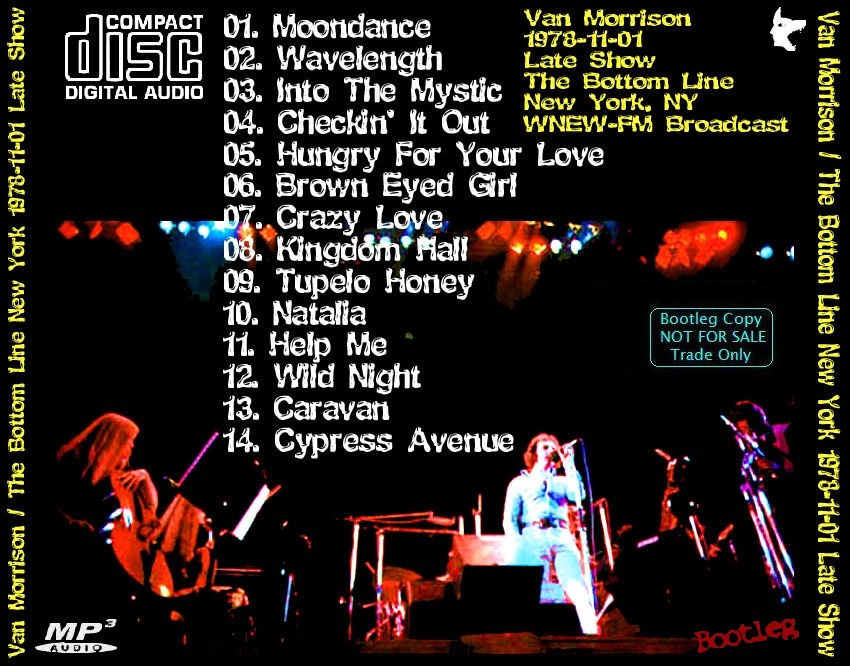 Todays first download is a set by Van Morrison that was recorded at the Capitol Theatre, Passaic, New Jersey in October 1979. This is in superb quality and the audio has been taken from a DVD audio rip. I've only posted one other Van Morrison bootleg in the past - I will be posting some more in the future. This is a classic show which features some of his best work - "Here Comes The Night" a wicked version of "Angeliou" which lasts 9 minutes and the classic "Brown Eyed Girl". This is a great set which is thoroughly commended. Live at the Capitol Theatre, Passaic, New Jersey 6.10.79 - Van Morrison (Bootleg) Quality : Superb Tracklisting : 01 Kingdom Hall Download Link : [Link] Filesize : 202MB (Including Alternative Artwork and Tracklisting) Back Cover : [Link] Total Time : 1h 28m 12s Enjoy!