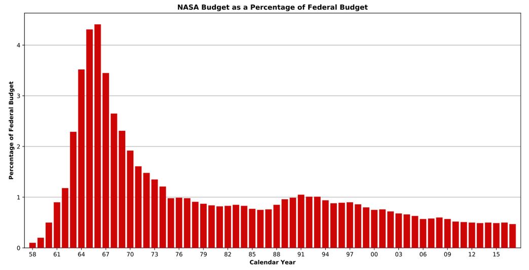 Well why if they had that sort of know then to do that,why has it not evolved to take man further...1969,get your head round that,almost 50 years ago..I was 10 and as gobsmacked as any kid watching it on tv(or was I). Edited by elgrande (29 Oct 2017 4.14pm) Nasa's budget in the sixties to reach the Moon was over four percent of the US's federal spending budget after Kennedy died. Since the mid seventies it's been under one percent except for 91 where it was a tiny bit over. It's been under half a percent of spending since 06. Priorities......You've seen on here that many people question why they do even as much as they do.