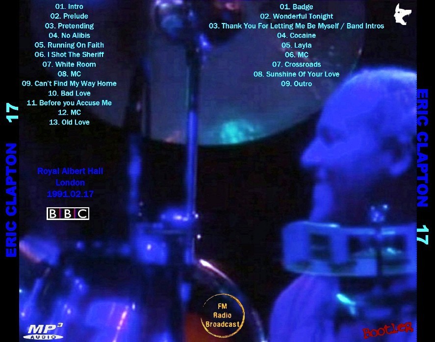 Todays first download is a superb bootleg by guitar legend Eric Clapton. This was recorded at the Royal Albert Hall in London on the 17th February 1991. The quality of this bootleg is superb - a really top show, the audio has been taken from a BBC FM broadcast of the show. Some classic tracks on this one from old slowhand from "Pretending then I Shot The Sheriff, White Room, Wonderful Tonight and Layla" are all played. If you like EC this is a must have - it's fantastic...... Here is a download link I found for :- "17" Live at the Royal Albert Hall, London England 17.2.91 - Eric Clapton (Bootleg) Quality : Superb Tracklisting : 01. Intro Download Links : Part 1 : [Link] Filesize : 331MB (Including Artwork and Tracklisting) The Line-up : Back Cover : [Link] Enjoy!