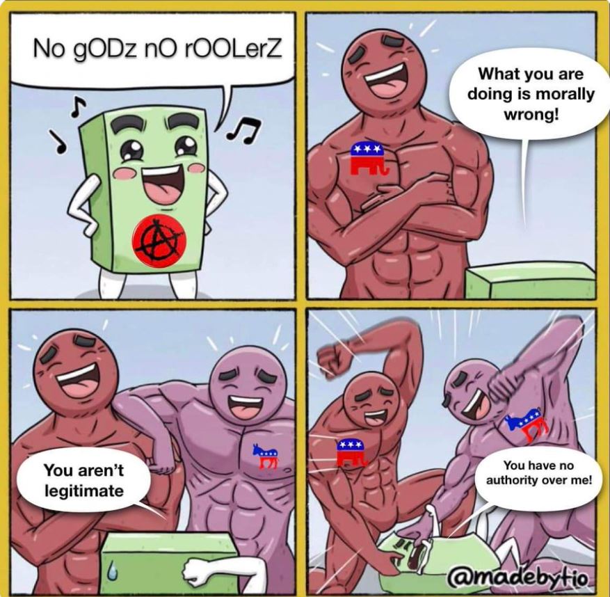 They have but this current debacle is something else. It is like the people on the left who were decrying Canandian truck drivers for sounding their horns, claiming it as violence, and then the following week suddenly becoming experts on their favourite MANPADS along with cheering on LITERAL Neo-Nazis aka the Azov battalion and proclaiming how it was understandable that Ukraine was torturing Russian POW's. If there is a single silver lining in the terrible tragedy it is that at least the Progressive Left has shown its true colours. When the jaw to jaw turns to war war there will be no quarter given. Yep, that's another thing about the left back in the eighties and before.....when they weren't in power they were all for free speech. In fact, a libertarian lefty was a highly common feature on the left. However, as soon as they had majorities within the institutions (given to them by the right) they dropped their support for free speech and instead adopted the authoritarianism of the last twenty years. They censor, deplatform and gate keep. No one can claim that there is effective opposition to that on the left...it defines them now. Now a libertarian on the left is a rarity. I'm prepared to believe that a fair amount of them were being honest in the past but since then the acquisition of power has corrupted them and the left in general. Free speech has long since been a non neo liberal issue....neo liberals believe in curated speech. I've been highly cynical for years over the change....to quote one of their early authors, 'there is only power, those that have it and those that don't'.....in other words the claim of principles are purely a media device. As for libertarianism....what a waste that proved to be...a noble but failed ideology....this meme sums it up. Edited by Stirlingsays (05 Sep 2022 10.47pm)