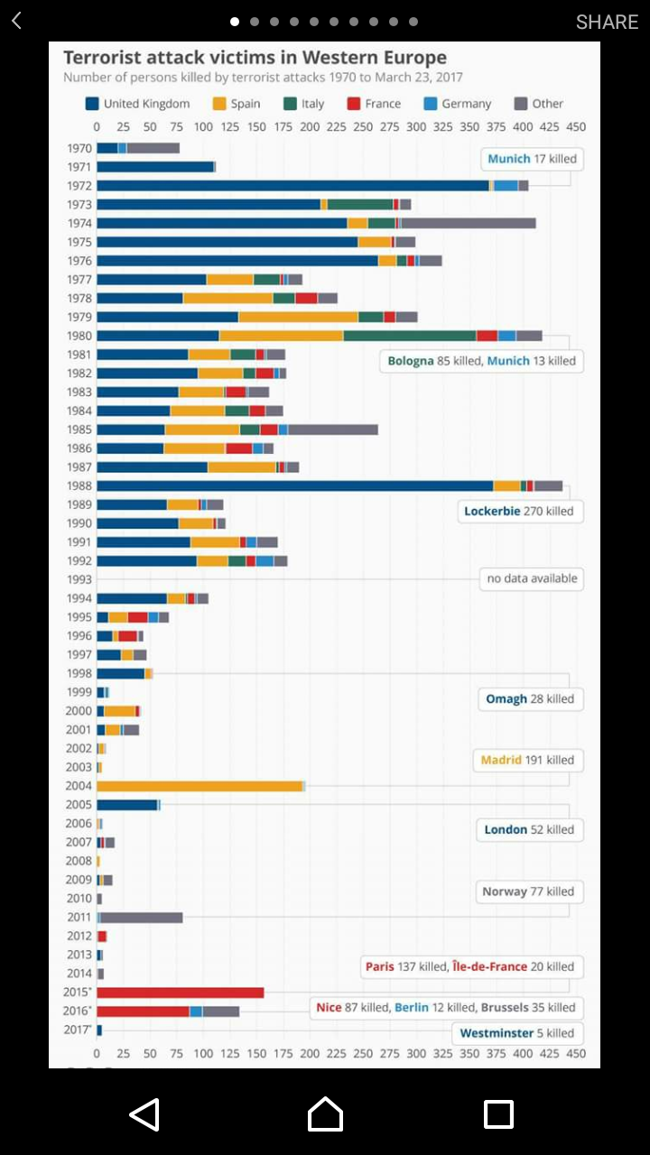 What with all the hoo haa, you'd think terrorism was at a peak right now. I hope pointing out such facts doesn't make me an apologist. Edited by nickgusset (28 Mar 2017 12.08am) Quite - its very important to keep events that are sensational in a real world context. Treating Islamic terrorism as some kind of existential threat to the UK is plainly absurdly disproportional to the actual threat itself.