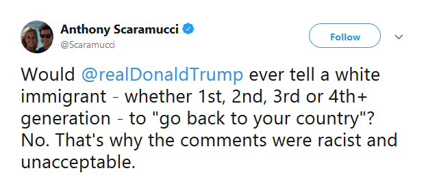 Where someone is born may well be important enough to argue against their point of view, rather than suggest they leave the country. Especially when they are state representatives voted in by the public. I notice in Trump's rally tonight, he's individually naming each of these women, slowly highlighting their 'foreign' sounding names, and leaving time for the crowd to boo and chant 'send her back'. Classy stuff. And predictably along the lines that I stated. Richard Spencer is someone I obviously completely disagree with, but he does have the guts to stand by what he believes in. There is no clouded view of his own outlook or excuses for other peoples. It is what it is and he is willing to deal with the varied reactions to that. In its own way, that's the American way. I prefer the fact that the Mooch agrees with me though. That's all that really matters at the end of the day..