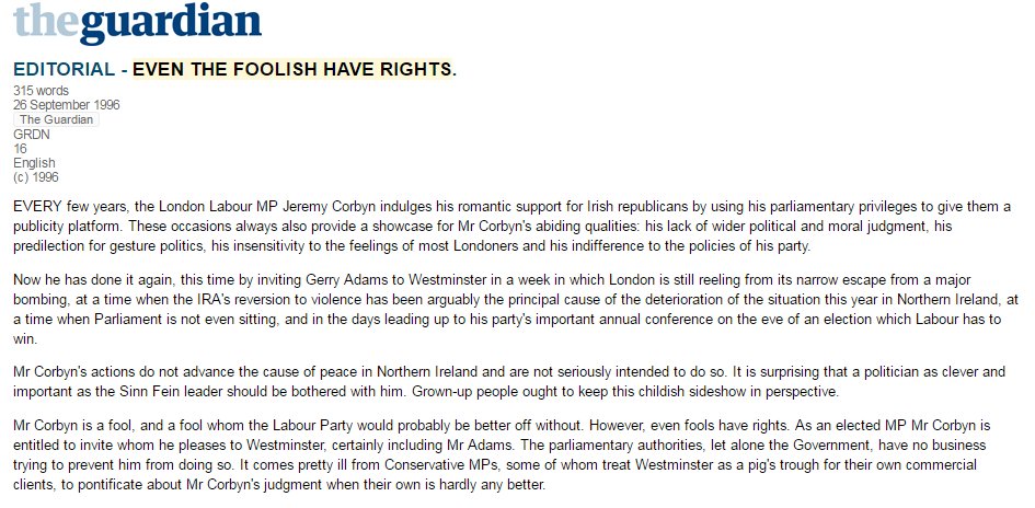 Of course, it's just the fascist, right wing press sticking the knife into the bearded one. Especially that organ of Nazism, The Guardian, who had his number way back in 1996. Edited by Cucking Funt (29 May 2017 6.18pm) I like the line "Corbyn is a fool" as it sums him up to a Tee. How he has lasted so long in politics I will never know. He comes out with so much hog wash, Lies and flannel he deserves a visit to the vets (if you get what I mean) He needs to sit down, think about his past and then remember what he has done over the years and just resign as he will never ever get to be our prime minister.