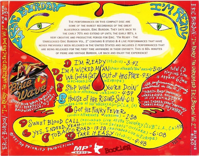 Todays extra download is by Eric Burdon and is the second volume of the Unreleased Eric Burdon that I started posting yesterday. This is another bootleg of unreleased tracks, demos and outtakes that are in superb quality. The versions of "House Of The Rising Sun" and "Tobacco Road" are amazing and worth the download on their own. This is a top notch bootleg - thoroughly recommended... Here is a download link I found for :- "I'm Ready" - The Unreleased Eric Burdon Vol II - Eric Burdon (Bootleg) Quality : Superb Tracklisting : 01. I'm Ready (3:42) Download Link : [Link] Filesize : 87.2MB (Including Artwork, Filenotes and Tracklisting) Back Cover : [Link] Enjoy!