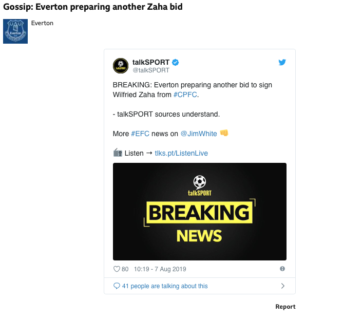 This post has been merged from a topic called 'The Wilfried Zaha Thread' by Midlands Eagle Everton's offical people sent out a statement last week to deny that a 70 Million bid plus McCarthy and Tosun had been submitted. Yet SSN still reported lies. Now they are saying Zaha is disilusioned with Palace and that a deal is likely. SSN and Talksport need to do wathever they can to keep him in the news. Zaha is one of the bbiggest players in the news this year so they will do whatever they can to keep their media wheel turning. Don't believe a word from them or that parasite Jim White.