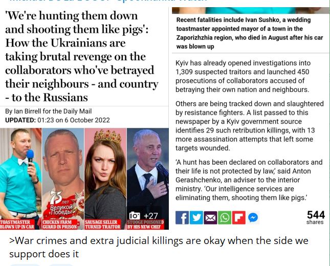 I'll highlight this because, while it's obvious to me and many, there are still those that like to paint this war as 'goodies v baddies' when the reality is that war means death for many many people who rarely deserve it. That's independent of which side does the killing. Here is a typical example printed in our media, where the mask slips and they are prepared to print a reality instead of just focusing upon deaths inflicted by Russians. But they use the double standard of portraying this as justice rather than what it is.....killing people who didn't support Ukraine....and those areas have always had pro Russians living in them. Both sides have been ethnically cleansing since 2014.