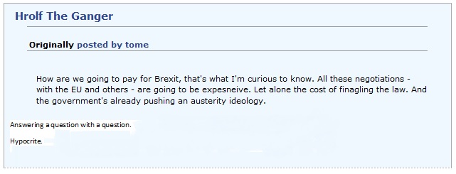 Who are you talking to? You actually. Sorry with all these left wing remain whingers. I get a bit confused. Edited by Hrolf The Ganger (12 Jul 2016 8.23pm)