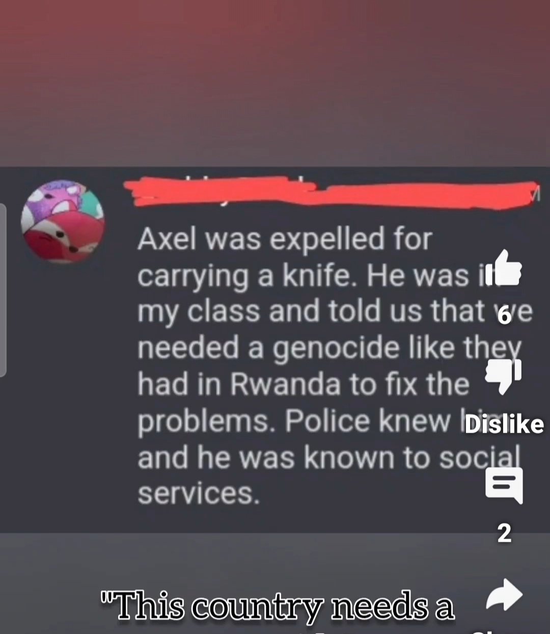 Axel Muganwa Rudakubana. Name was correct so lets see how much of the above comes out. Edited by Ouzo Dan (01 Aug 2024 1.42pm) I love how the media feel it's important to continually remind us he was born in Wales. I wouldn't be surprised if they refer to him as a right wing Welsh nationalist.