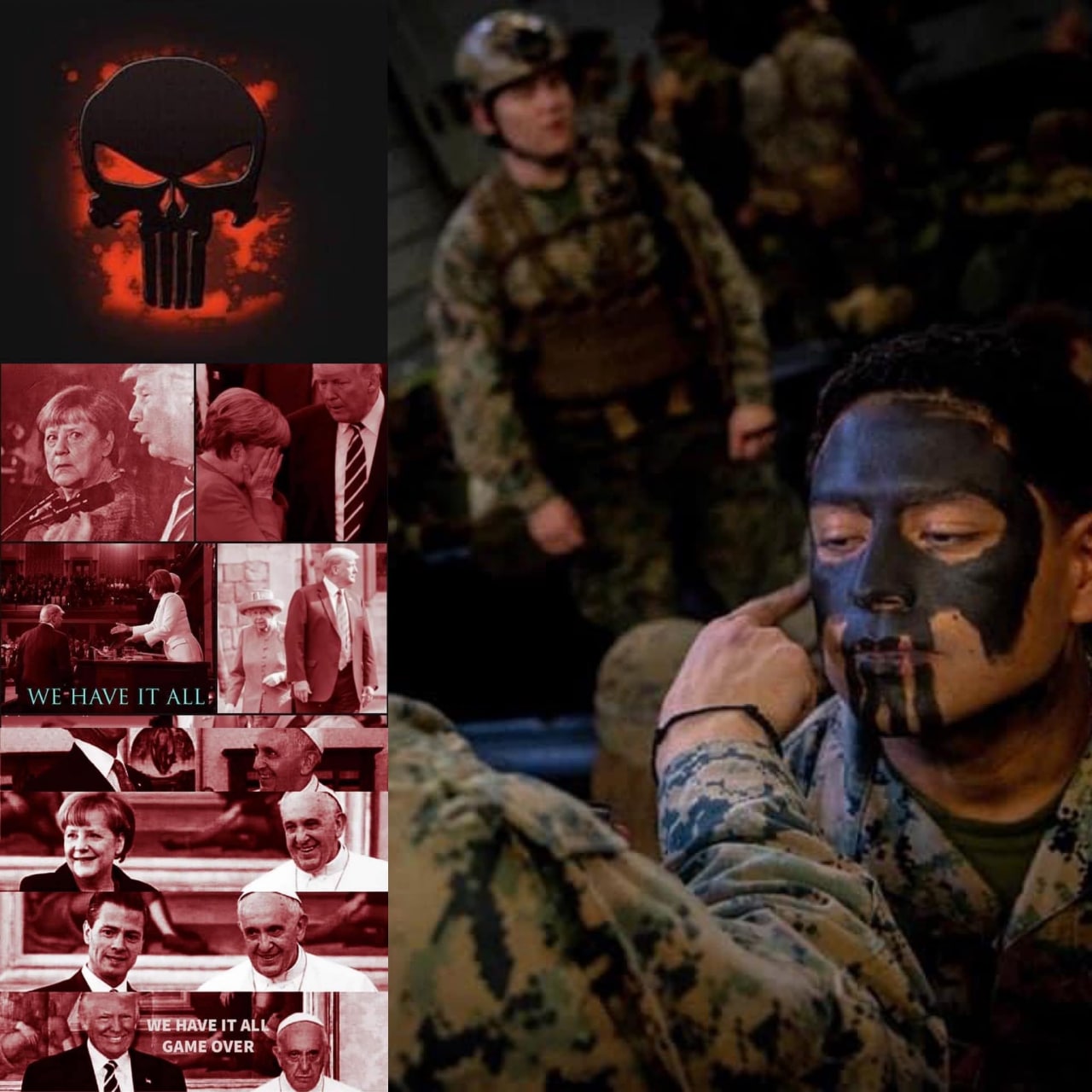 Military is right behind trump They know the truth. Check them wearing the face paint featuring the well known Q image of silent war. That image q has been posting endlessly. Military out in their droves in dc 15k of them