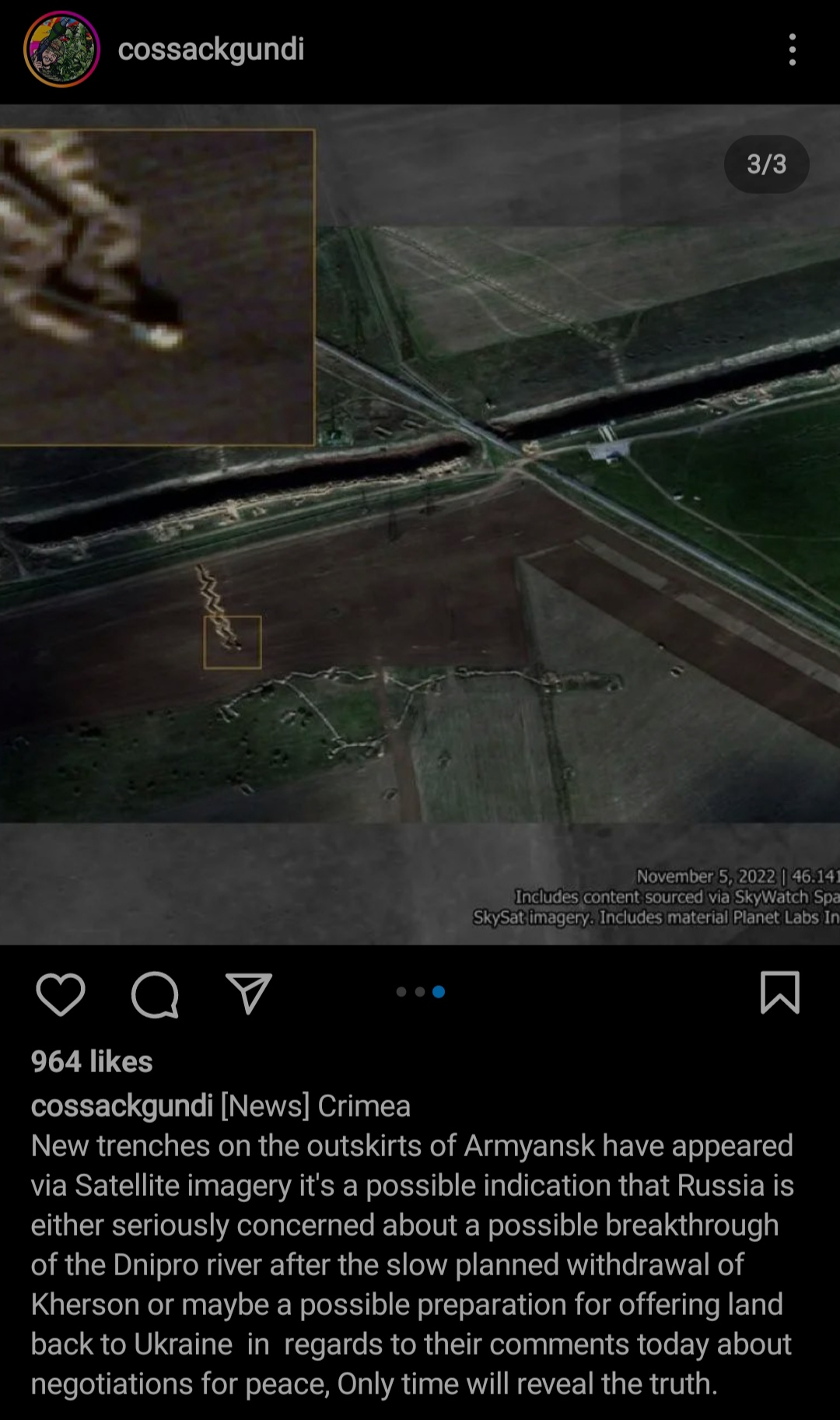 Some leadership of the Ukrainian army believe that the retreat of the RF Armed Forces from Kherson may be part of an information-psychological operation to mislead Ukraine. Interesting to see what happens here. They've been fortifying Kherson for weeks if not months & then to call a retreat is very odd. If the Russians have retreated this opens up a new flank on Russians forces east of Kherson. Its flat, horribly flat, I would'nt want to be a tank crewman on either side.
