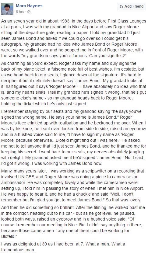 Someone tweeted this story about Roger Moore. There seems to be many of them