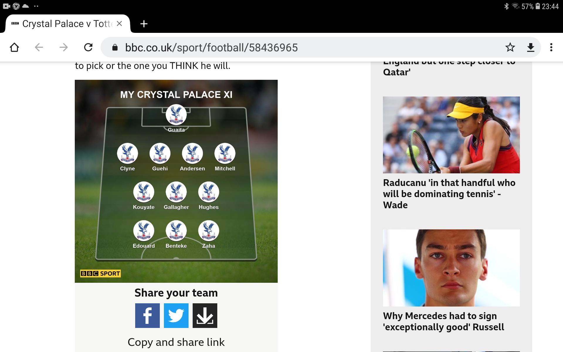 What's the team then? For me: Guiata Ward - Guehi - Andersen - Mitchell (would've been JS) Luka - McArthur Rak-Saki - Benteke - Wilf I would have: Guaiia Clyne Guehi Anderson Mitchell Gallagher Hughes McArthur Rak-S Edouard Wilf Subs, Butland,Ward,Tomkins,Hannam,Kouyate,Luka,Olise,Ayew,Mateta, Schlupp if he was fit I would have Benteke serving the Oranges at half time but i think he may drop them