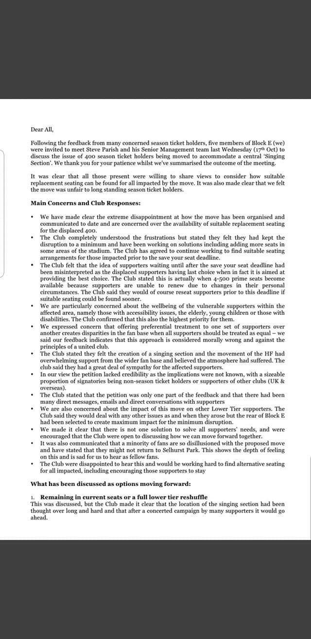My understanding is they met on the 17th October. I will try to copy the link to the minutes below. Hope it works! Sorry, I meant that they hadn't met all of us in the "open day" that's said to be planned for November. Thanks so much for posting the minutes of the first meeting. I am a Block E season ticket holder and hadn't seen any of that info prior to you posting it. Although I'm still massively disappointed it has helped to allay some of my fears about finding a seat for next season.