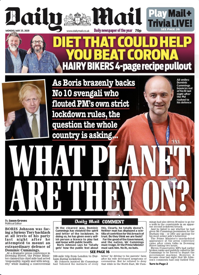 The Daily Mail are digging into Boris and DC. I’m a bit surprised because I thought they’d back Boris if he came out deflecting it. But I think this might be because the mail are pissed off with this 7 month economy crippling lockdown with a bit of tapering off towards the end. I’ve read that only 3 on tory backbenchers Whatsapp group back Boris. My understanding is that 7 Tory MP's have backed sacking Cummings with another 1 retweeting a message. So 8, tops. And of those it is only Steve Baker of any note. As to the Mail, when Dacre stepped down they became far more anti-Tory and specifically far more pro-remain. Newspapers are doubling down on this because this is potentially the tipping point for the Print Media in its entirety. Up until recently if this many editorials called for a sacking it would have happened. Now? No. Balance of power has been changing for a while now and this could well be the Waterloo. If the Mirror and the Guardian can come up with a verifiable smoking gun then Cummings is done for. And I was expecting it today. Instead, nothing. These secondary claims are as weak as a super-market value can of bitter. In and of themselves absolutely froth. With number 10 absolutely definite in terms of their refuting the claims. This time last night I would have put Cummings chances of survival at about 30-70, purely because I could not see why the Mirror and the Guardian would make the claims they did without substantive proof. And they might still have it but if they have, then today would have been the time to put it out there. Right after that Press Conference which Johnson chose to take. He was not scheduled to do so. If Cummings is still in post by the end of next week then we have seen a fundamental changing of the goalposts in British politics. It cannot be underestimated. A potentially fatal blow to the traditional print media.