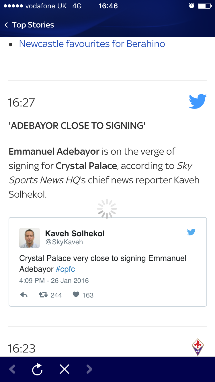 16:57 BREAKING NEWS Crystal Palace have completed the signing of former Tottenham striker Emmanuel Adebayor.