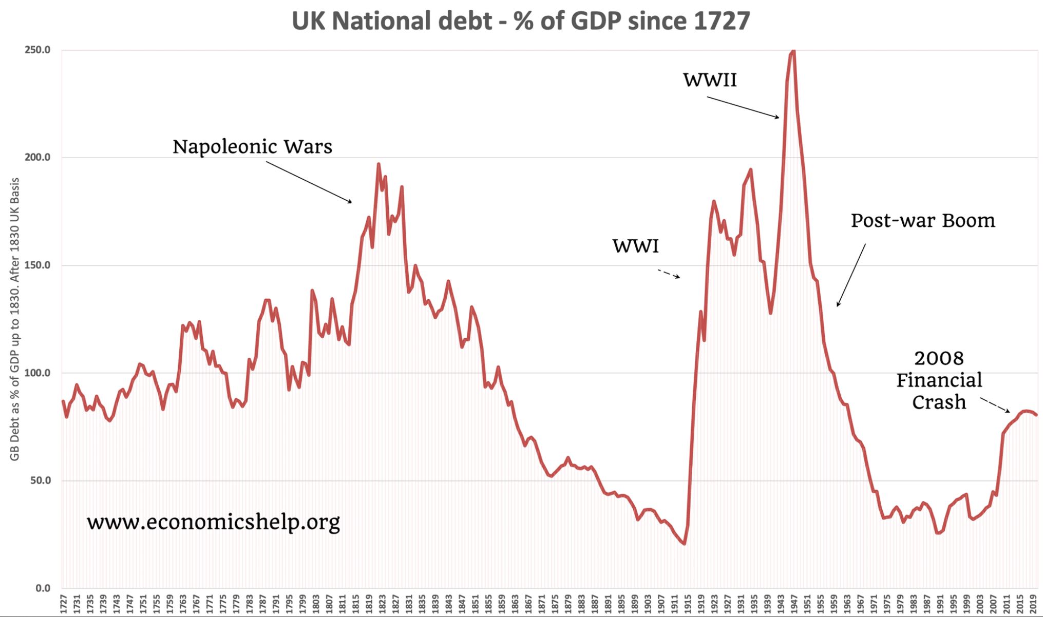 Economic theory as based on centuries of empirical evidence = wrong. Stirling's opinion formed in his own underground shelter based on his loose understanding of how things work and his thoughts on how things *should* work in his own mind = correct. An unserious man. What irritates me is that you accuse me of ignorance and arrogance when your own statements appear to show little more detail than GCSE level understanding. My position is supported in the economic world probably at levels higher than your apparent one. The economic theory of centuries does not support your 'just borrow' and MMT approach as ok. There are countless examples where excess borrowing has ruined economies: from Argentina to Germany itself. Interest rates change Dan and are governed by global events outside our exclusive economic control. You ignore the truth that economies are built completely on confidence. That confidence is that repayment will actually be guaranteed on debt and that requires an economy that outperforms it. It's important to note that it's not just government debt that's the problem either. Personal and corporate debt are at unstainable levels and this also has to lower which will affect people's wealth just as much if not more. As I stated at the beginning....and it still remains true. The position of people like you is that of a tightrope walker predicting that no gust of wind will ever blow him off his rope. Our current debt to GDP is at levels not seen outside of world conflicts and the evidence of the past is that an upward curve is not sustainable. It has to move downwards not upwards for economies to work. I will attach the stats that show that economists throughout the ages have understood this. The graph doesn't show the years since 2008 but I understand we are up at WW2 debt levels now. The statistics show that after both world conflicts debt levels reduced significantly compared to before. These levels took many decades to come down to good levels and the affect upon and the common man (you know those your politics lies that it cares about) wasn't wonderful.....and that's in times where the welfare burden was nothing...I repeat nothing compared to today. Personally I think our GDP will perform reasonably compared to our competitors however for this decade it won't save us from coming economic burdens. The future is a gathering momentum of economic hardship for the majority unless something in this picture changes. Only technology (which politicians rely upon) can offset it.....Can AI and automation save modern economies....In my view that will take time and until then vulnerable people are going to suffer before and during transitionary phases. And people like you just fool yourselves and others....like your idea that taxes don't need to increase. You completely ignore the very real difficulties and problems concurrent with your approach within the modern context. When the truth is that economically this decade will be more like the fifties than the nineties for most. But everything's going to be ok in Dan's 'fantasy economics' universe.