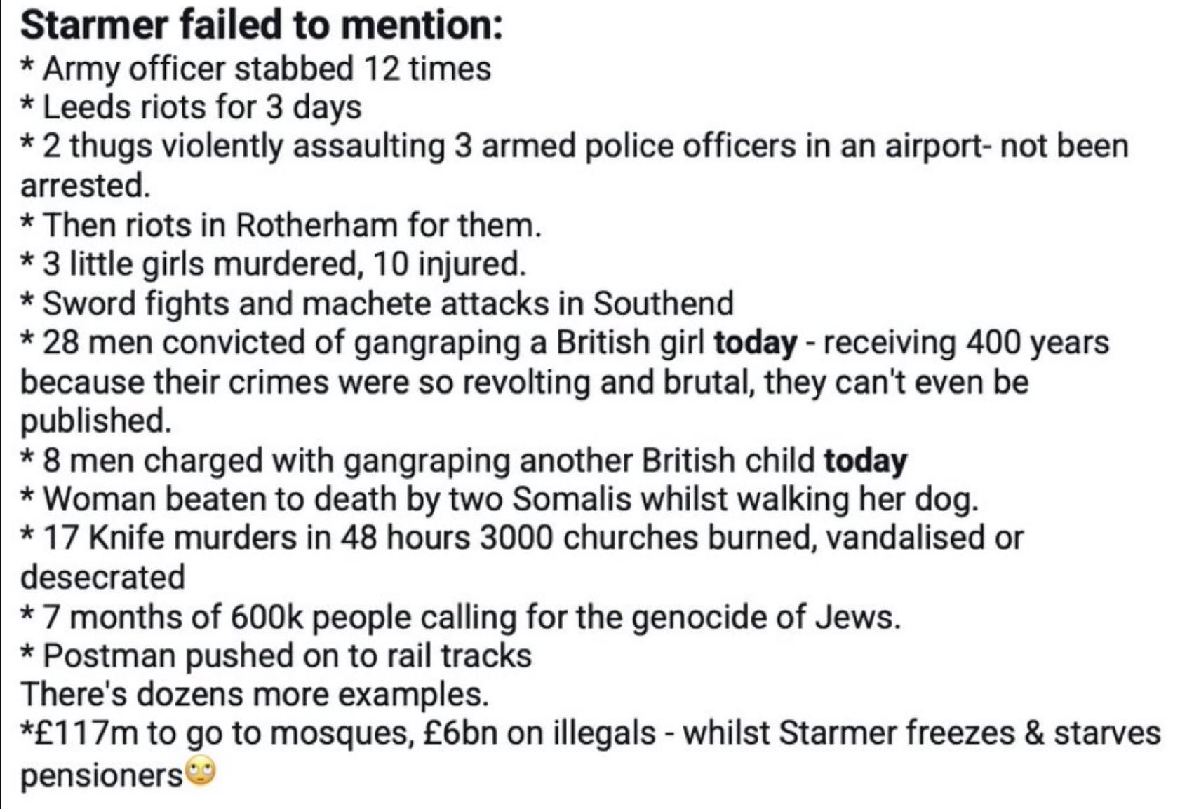 This image points out the double standards but in truth it doesn't matter what Starmer said....we know that Sunak would have said the same thing as they are two sides of the same coin. Ultimately what happens is all a matter of demographics, timeline and human nature. Edited by Stirlingsays (01 Aug 2024 10.43pm)