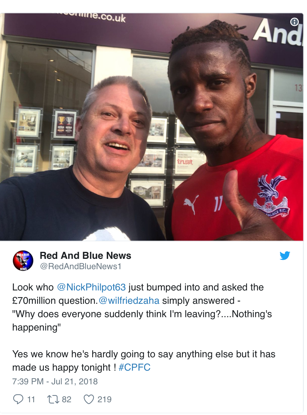 Look who @NickPhilpot63 just bumped into and asked the £70million question. @wilfriedzaha simply answered - Yes we know he's hardly going to say anything else but it has made us happy tonight ! Seems legit...