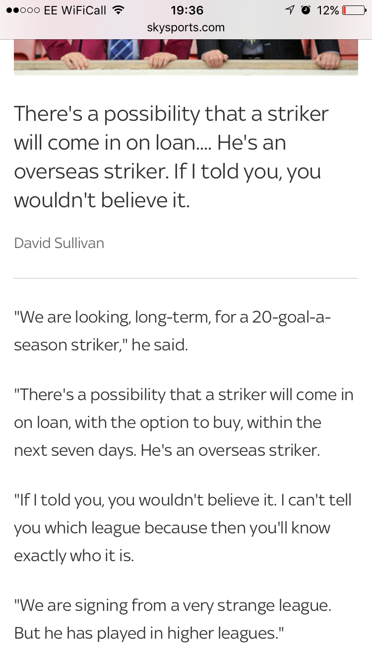 Looks like he might be off to West Ham Can't think who else Sullivan might be eluding to Edited by palacetilidie1905 (19 Jan 2016 7.55pm)