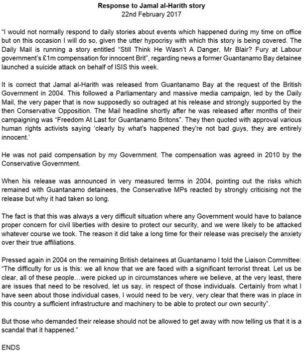 Tony Blair has denied that a Labour government paid compensation to the former Guantánamo Bay detainee who went on to blow himself up in Iraq, in a strongly worded statement in which he accused the Daily Mail of hypocritical coverage over the Manchester-born jihadi’s death. The former prime minister said that compensation – though to amount to £1m – was paid out under the Conservative-led coalition government in 2010 - and criticised the tabloid for blaming himself and Labour instead.
