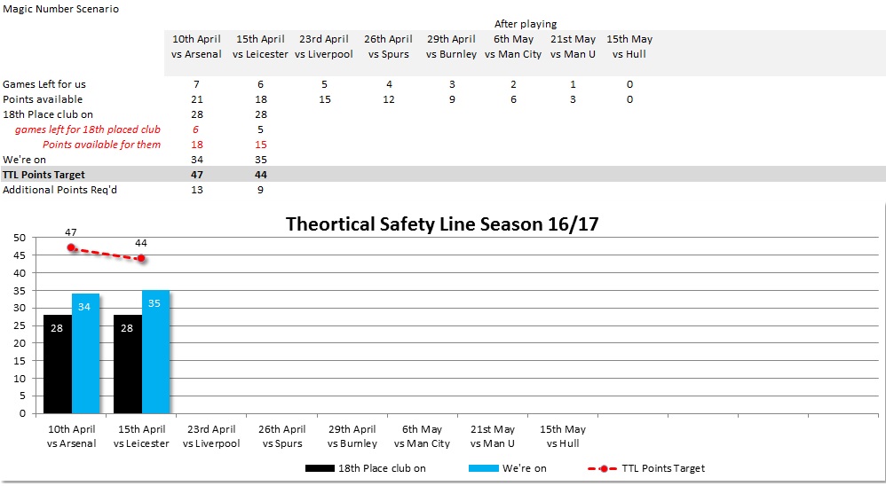 I do not see any of the bottom 3 get more than 34 points, with our goal difference, we were already safe on 34 after the Arsenal result. - Swansea have 8 wins from 33 games (1 in 4) and now have to win 3 of 5. All mathematically achievable but, in reality...? Edited by Ray in Houston (20 Apr 2017 7.28pm)