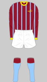 back to stripes please but if the shorts are blue then the socks have to be red with a blue band or vice-versa - why not a claret and blue away kit, with a touch of primrose for good measure?