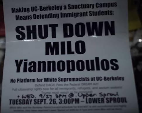 Berkeley isn't cancelling the event, Milo is. I'm sure the 4 - four, total - speakers he had confirmed will be disappointed. You seem to have a giant bee in your bonnet about education establishments oppressing free speech - I believe this is the 4th or 5th thread you've started on the subject in the space of about a week. To a hammer, everything looks like a nail. Well, Berkeley shut down Milo in February. Where do you get your information that Milo has cancelled this event?....I'm not sure what the significance of the number of speakers is. Posters currently up on Berkeley campus. Edited by Stirlingsays (22 Sep 2017 8.18pm)