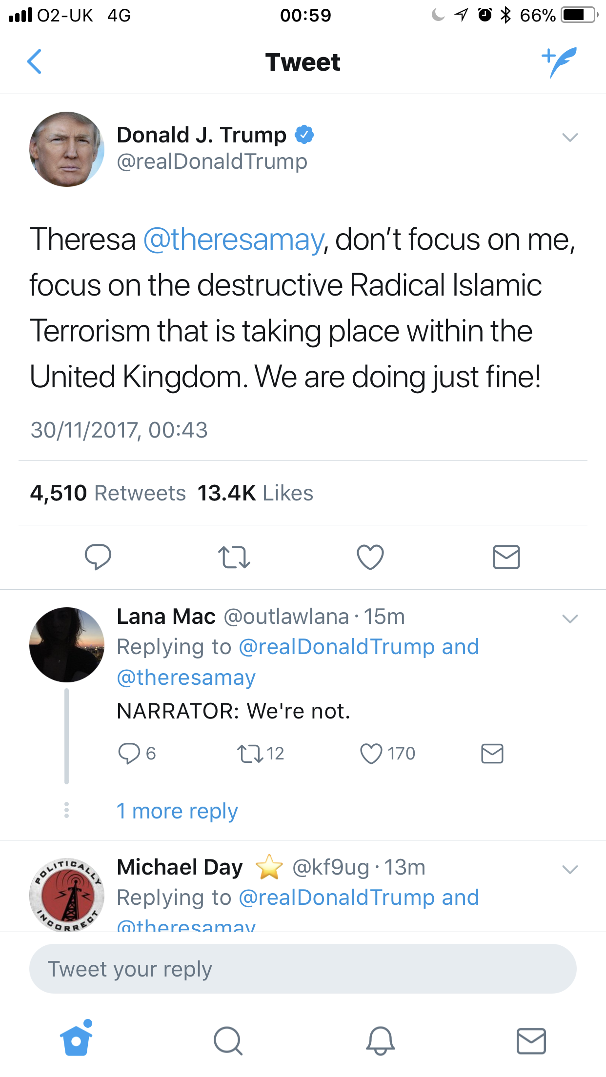 Yes of course, that's why you mock the idea of verifying these videos, and then when one is thought to be something other than some mad muslim migrant attacking someone, suddenly it's an irrelevance and you can't move on fast enough. Take a break with criticising others with advice you don't bother following yourself. Another link regarding the video since you mock the idea that it may actually present relevant information [Link] I highlighted both the disgusting nature of religious extremism and also those like trump who basically just have it in for certain groups and harbour their own ideological weirdness. Not everything is about you. You've dragged it away from the point I made, that Trump just did a scattergun approach to attack people via his dog whistle Britain First retweet, without checking any facts in the process. It's something that may be useful for other people to know. Edited by wordup (30 Nov 2017 12.37am) I've mocked people who criticise and downplay very real threats. I've addressed your other points in previous posts. As for Trump....he's Trump and I've criticised him too. Edited by Stirlingsays (30 Nov 2017 12.48am)