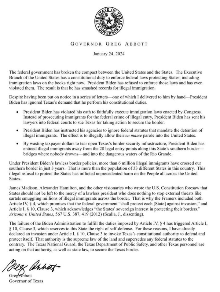 Abbott, the governor of Texas, writes to Biden, announces that the 'federal government has broken the compact between the United States and the States'. The Texas military posts: [Tweet Link]