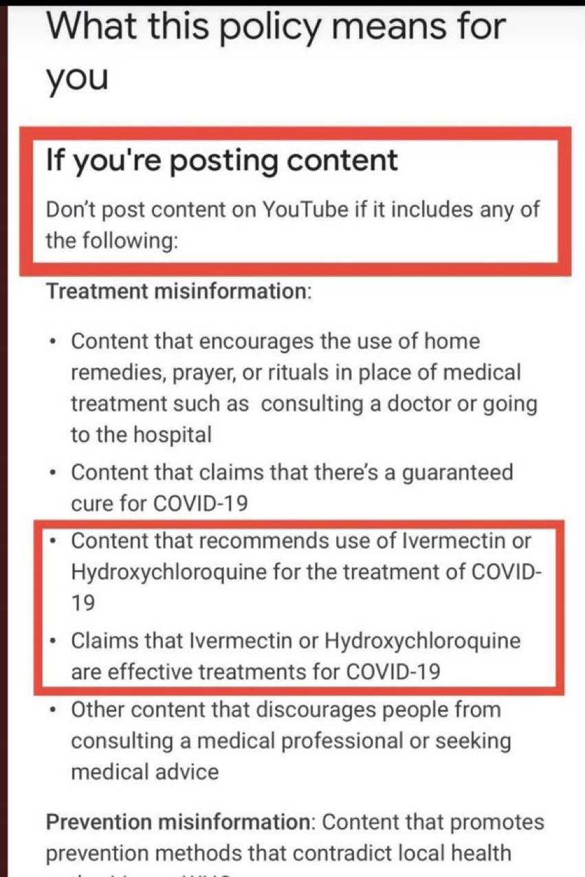 Did they do the same with Ivermectin as well? Seems to be plenty of debate about it on YouTube so what did this geezer do wrong? They appeared to get especially trigger happy with warnings when people didn't in their view offer enough caveats or weight to treatments already in place. That was in the reply specifically sent to him. I just feel that where there is clear disinformation fair enough, but in some cases they've moved beyond that. Youtubes actual policy states that people should not recommend the use of Ivermectin or claim that it is an effective treatment. I do not believe this is a reasonable stance, as at this point we don't have the answer to some of these questions so people should not face consequences just for holding a view that isn't exactly 'out there'. Like I said, I would prefer Youtube to do a tough job better as in the long run it's to their detriment if they don't. There are clearly entirely anything goes video platforms but due to the nature of why they even came about, it's mostly conspiracy sh!t and nutcases (the 'Captiol crowd' and people who have zero problem with neo nazis but faint at typical everyday views). You're more likely to get a death theat than a critique if you have anything half normal or nuanced to say, so I'd rather Youtube keep things as broad and open as possible rather than drive people to places that tip them into a social and psychological no-mans land.