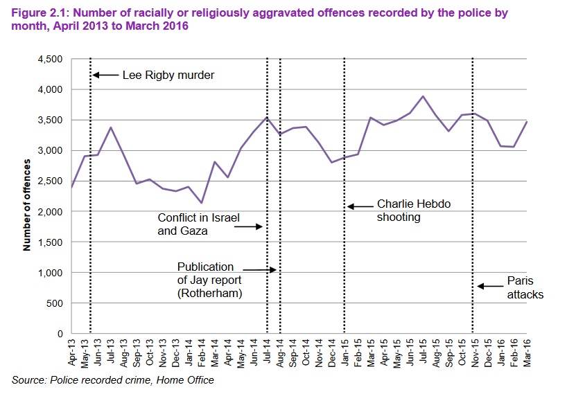 Yes, in East London. They gave girls hassle... a mate of mine threatened to smack the s*** outta three of them in Hackney. They called the police on him. Total tossers. How many were there? Three. How many of these vigilante groups are there? How many people are we talking about that are involved. I remember when people said all muslims are poppy burners. How many were there? about 5, yet those idiots on the fringes are deliberately held up - it's insinuated that it's a helluva lot more than that when there is no proof. This peer reviewed report [Link] Understanding who commits One study on hate crime offenders identified four broad categories of offender – ‘thrill seekers’, ‘area or territory defenders’, ‘retaliatory offenders’ and ‘mission offenders’. The socio-demographic profiles of hate crime offenders tend to match the demographics of the population of a given area. The majority of hate crime offenders in the UK are white, male and under 25. Hate crime offenders convicted of more serious and violent offences tend to be older. Contrary to classic portrayals of hate crimes, very few are committed by strangers. A small proportion of hate crime offenders appear to ‘specialise’ only in hate crime. I've skim read the report but doesn't really break down racial profiles that much. Still worth a read though. This report is also an interesting read as well [Link] a home office document called Hate Crime, England and Wales, 2015/16 The chart I've attached shows hate crimes vs 'events'