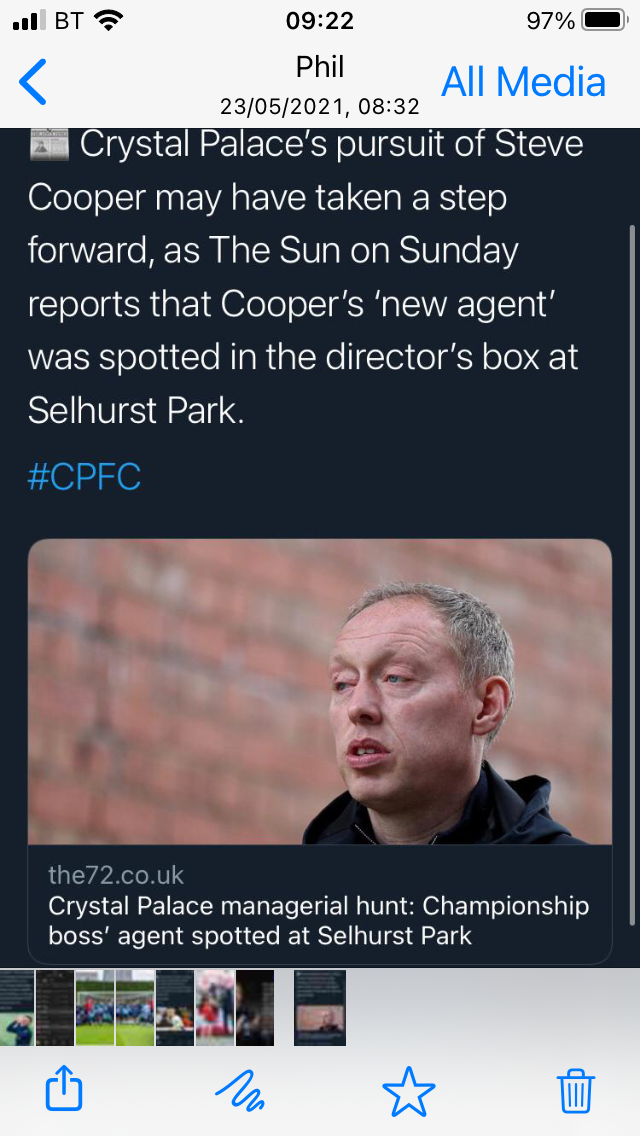 More seriously, Cooper has shown with younger age groups that he's a winner-coached England's U17s to a world cup win and took them to the Euros final. He's now got Swansea one game away from the PL. And a serious question, players in the last year of their contracts can do deals once the January transfer window is closed. What's the situation re managers? Are there any rules? Suppose Swansea win play off final and are promoted,why would he come to Palace?? In that scenario,perhaps we should target Thomas Frank??