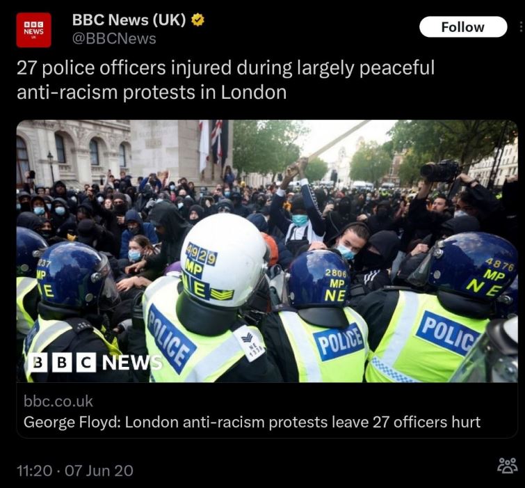 That’s very revealing. GBNews describes those creating the chaos as “protesters” and “demonstrators “. Try as they might though they cannot whitewash the real attitudes of those involved. Which can be easily discovered if the whole story, rather than just the headlines is read. Whilst my least favourite tabloid, which I regard as a right-wing rag, at least approaches this story with a degree of accuracy. It calls them “masked thugs”! I look forward to reading how anyone attempts to justify this behaviour. Surely anyone with an ounce of decency will condemn it outright. It should have no place in our country.