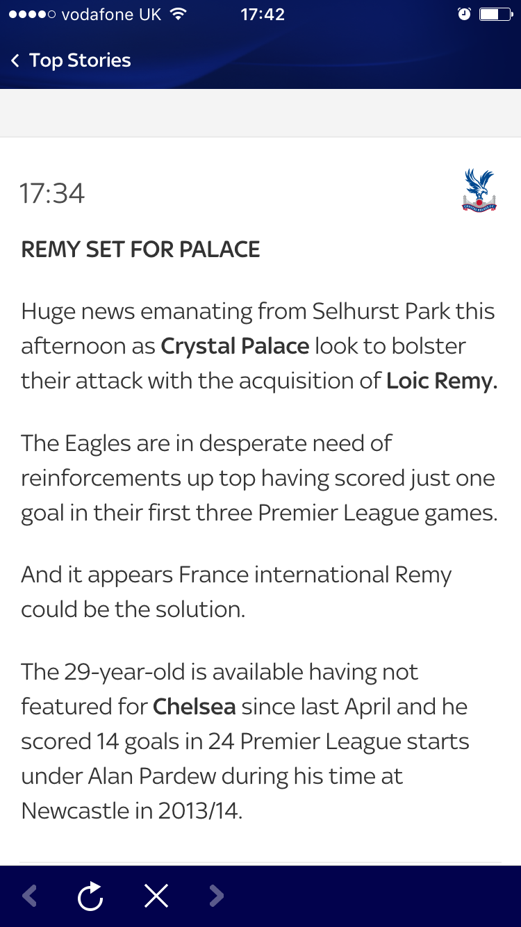 It's in yellow so it's got to be happening .....BREAKING NEWS Chelsea striker Loic Remy is set to join Crystal Palace on a season-long loan, according to Sky sources.