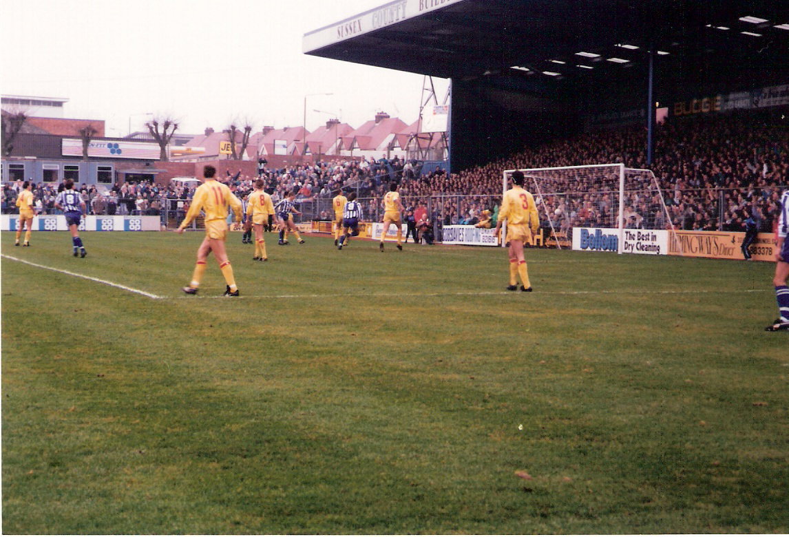26.12.88 Brighton 3 Palace 1 Another defeat at the Goldstone and another poor performance, in front of 3,500 travelling Palace supporters. My main memory of the day was the usual gallows humour from our lot: On came Rudi Hedman for his senior debut and spotaneously Palace fans start a rendition of The Specials hit 'Message to you Rudi', with someone taking the lead 'Stop your messing around' and the rest of us backing with the 'ahh ahh ahh' bits..... It's one of my funniest memories on the terraces and just so typical Palace in the face of another Brighton humiliation. Pic 1: I think this is Bremner heading number one for Brighton. You can just about see Brian Parkin diving in vain. Infact, I believe this was his final senior game for Palace as Suckling returned in our next game and saw out the season. was there for that one too