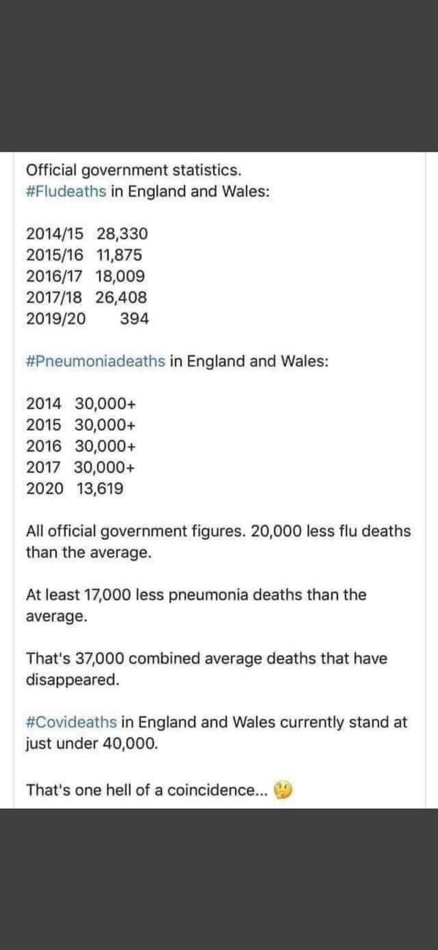 What you should do is try and bamboozle that Mike Yeadon with your waffle. If you think he and plenty of others are so wrong then you could prove him wrong quite easily. Should be easy hey? But you don’t have the experience to do so. In fact many scientists have avoided him, as have Hancock, SAGE, whitty and valance who he worked with for years. He made public attempts to ask questions and none of them answered. What grates most people is the only questions allowed are vetted questions from disappointing current journalists, and is why people stopped bothering with it. Some of their stunts in presenting some things haven’t had the desired effect they did in spring because people catch on. Start being consistently honest and more people would get on board. I truly believe that. For too long they’ve acted like they know, nobody else knows or has any sense. Hancock is the worst for that. What does any of this have to do with the stated facts of the post at hand and your inability to acknowledge it's untrue. It's no surprise that facts you don't want to know become 'waffle'. I don't much care if you want to divert and hide behind your twitter dr over the fact that you've repeated stated and posted flu and pneumonia statistics and ascertains that are provably misleading and cobbled together from completely different methodologies. It is made much worse by your complete lack of acknowledgement at doing so, efforts to avoid talking about it, and disinterest in the inaccurate and contrived nature of these contributions. And so again with regard to the statistics you posted (attached): "- The propoganda image and data excludes certain lower number years You're accusing others of being misleading or lying, while your own contributions such as those this tick that box to a tee. The government can be faulted on 'many' fronts, but when you do so based on disinformation it severely detracts from others actually demonstrating a balanced and honest look at the various genuine facts and reference points at hand. Unfortunately you've found yourself down such a blind alley that you've launched in at people who aren't even massively into 'lockdowns' anyway and have posted thoughts and articles that are varied, not solely of an angle. You simply can't seem to appreciate the fact that an objective reading of the facts is a valid approach, and that not everyone is obliged to opt into a check box Us vs Them one tone propaganda effort.