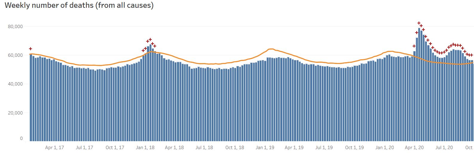 I sent a link showing you precisely where the extra 280,000 deaths are. I may be misunderstanding but doesn't the link you just sent only go up to March 2020? That was before the vast majority of the additional deaths. "During the first 34 weeks of 2020, 280,000 more people died than during the first 34 weeks of any of the five previous years. From March to August 2020, the number of weekly deaths was consistently higher compared to the weekly deaths of any of the previous five years. "