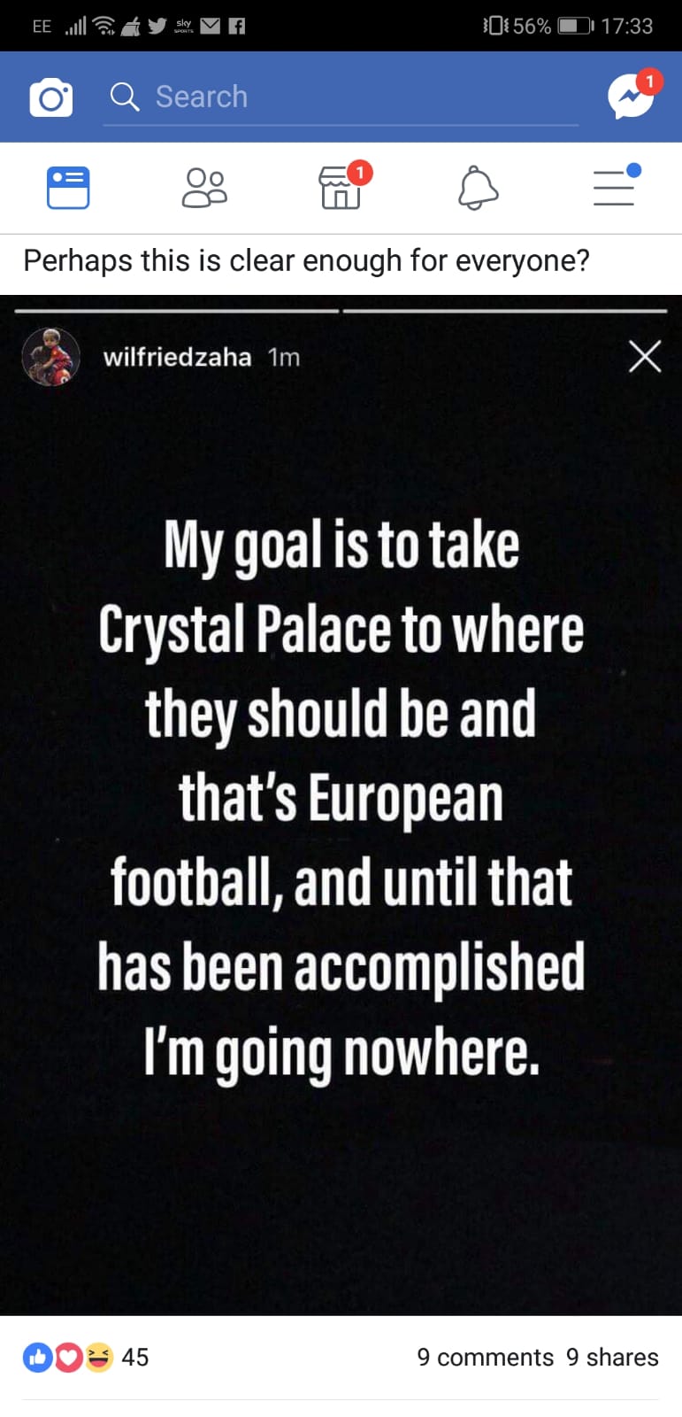 He’s jut posted saying it wasn’t about football. Make of that what you will Zaha is not stupid enough to put that post out at this point in time and not know what its going to cause. Seems to be some kind of back and forth playing out through the media. If I was Zaha, I would be pretty annoyed at the lack of transfers, and the talk of another season avoiding relegation. Perhaps he is making it clear that he expects more ambition from the club and while he has not intention of actually leaving, he wants to show Parish that things need to change. My word he is right, too.