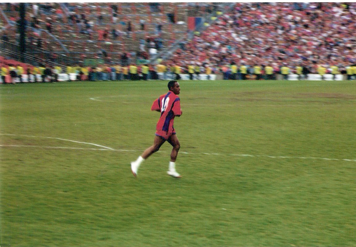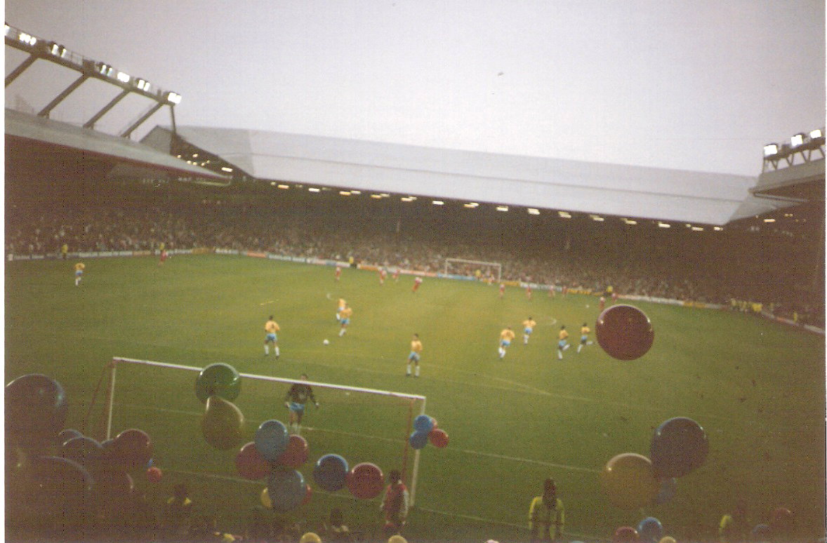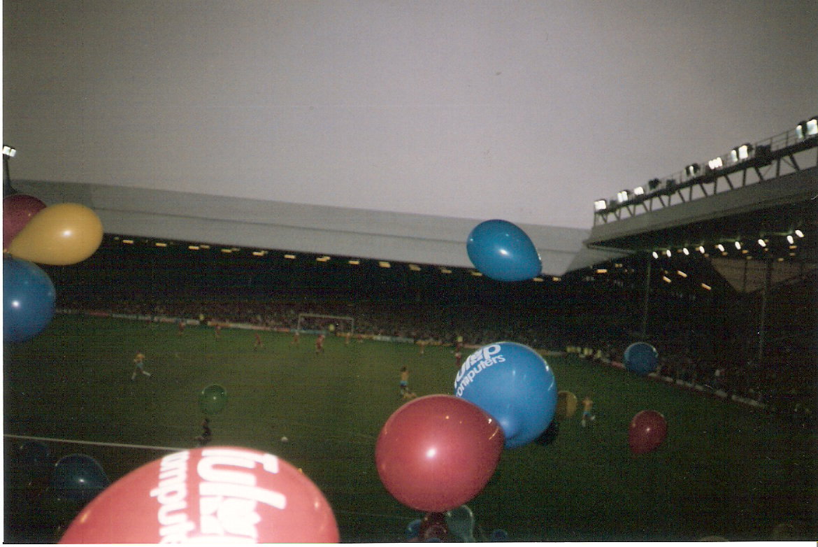 Anyway, goals from recent £1.8m signing Gabbiadini, and Thomas saw us come from behind for a famous victory. Souness was their manager at the time and was beginning to feel the heat from the Anfield crowd. I certainly remember their support being highly critical of their manager after that game and to their credit, complimentary towards us. Not the best two pictures in the world, but the view from the away end as the players in the Brazil kit, take to the pitch to red, blue & yellow balloons courtesy of our new sponsors: Tulip. After this game, Andy Gray became the 5th Palace player in a year to get an England call-up. Out of interest, at this stage of the season we were only 6 points behind eventual title winners Leeds. Just makes you wonder, had we not lost Wrighty and not had that terrible luck with Salako, how close we would've got to doing the unbelievable.