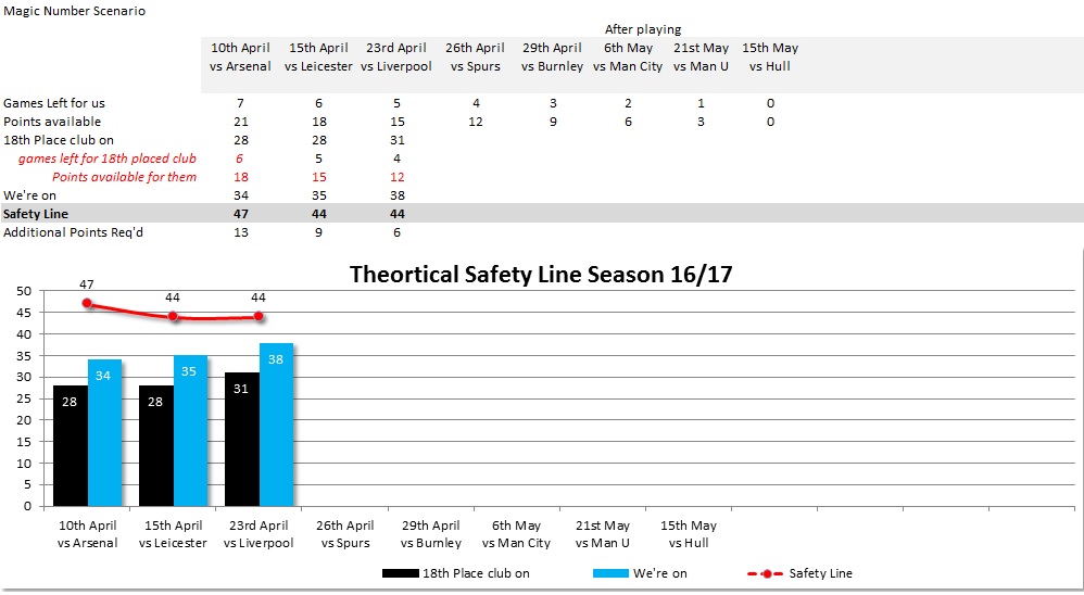 We can be safe this weekend. If we win and Swansea only draw then thats enough No quite. That would mean that Swansea could still tie us on points, although we'd still be above them unless there's a 22-goal reversal in goal difference. One loss for Middlesboro (whose remaining opponents are Man City, Chelsea, Southampton and Liverpool) puts us out of their reach. Two losses by Swansea does the same for them, and they play Man Utd and Everton next.