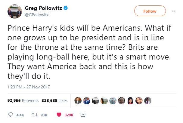 I suggest you look at the comments in the mail then... Probably the express as well and some readers of the sun, whether a 1 minute joke or not. If he was the eldest son then you'd probably get a few more people being bothered, but unless William &Kate's plane taking all 5 of them on their skiing trip crashes, Harry will never be king so anyone bothered about blood lines and Afros needn't be. Eventually they'll be as relevant as other siblings of kings and queens. If he was the eldest and was marrying a woman whose parents were both black and she was very dark then there'd be more with an issue, possibly some inside closed doors of Buckingham Palace, whether family or senior staff. If it was stopped or it was engineered to not happen then the Royal family would be finished globally and then domestically. No issue for me but you can't pretend it wasn't an issue very recently and still is for some, especially if the above happened.