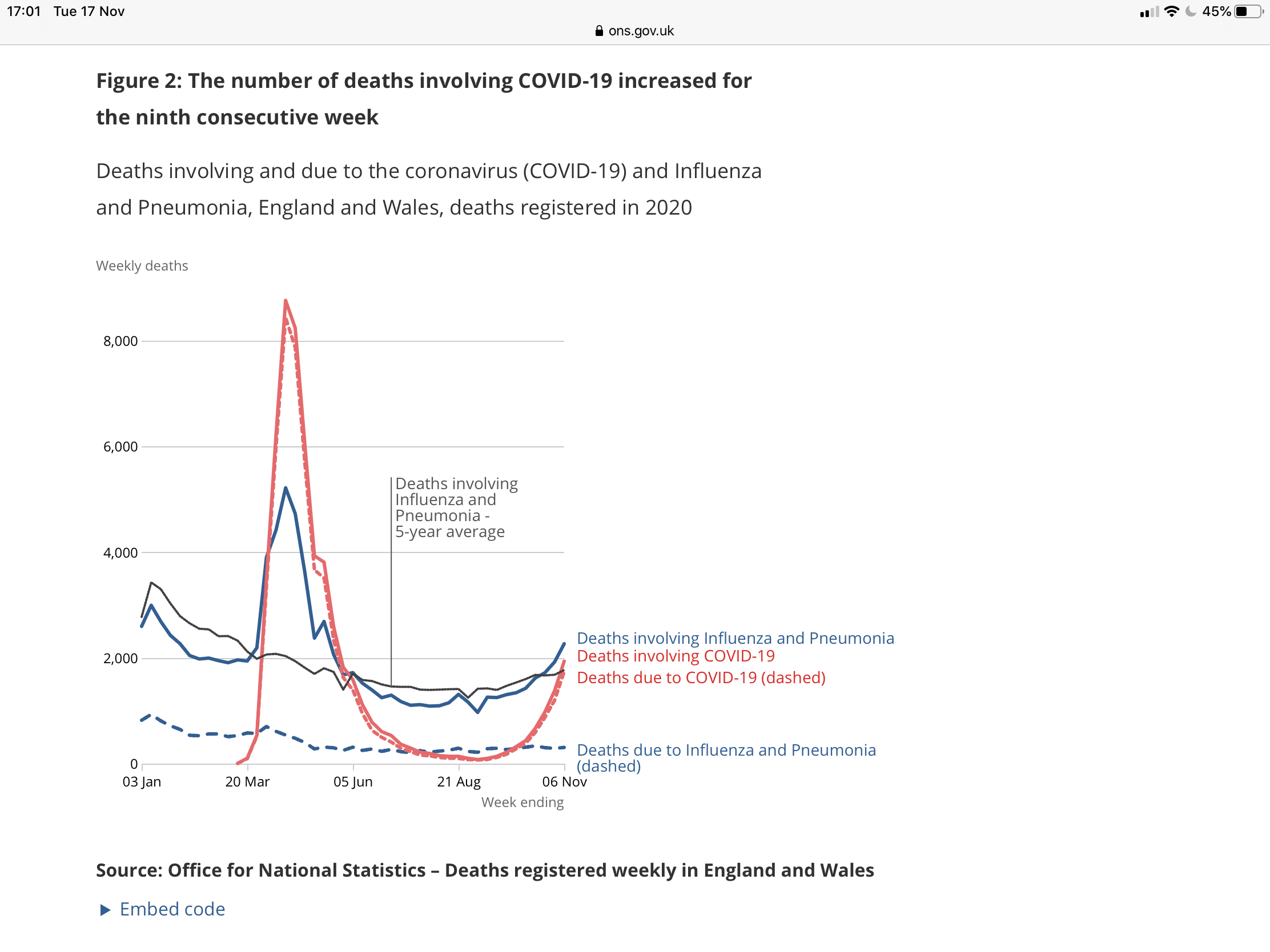 With not much of an increase in excess deaths and the real flu season kicking in in December or just before, we unfortunately cannot draw conclusions on that graph you posted. I can bet that certain parts of the country around d where we are won’t have the same issues because the old people at the end of any chains there might be will be taking heed of the real issue and advice that can be life and death rather than the cases farce. Rudi, the graph posted was in response to TGH ‘64’s request for a graph showing recent COVID-19 deaths. I don’t think there is a more accurate and relevant graph, in the circumstances, than the Office for National Statistics OFFICIAL data and their own graph showing weekly COVID-19 deaths, the most recent release of which was today! (17/11). I’m merely providing the link to the data and the graph, I’m not asking anyone to draw any conclusions from it but if you are seriously telling me you can’t interpret what it is showing then in the interests of your own credibility, you should leave this subject well alone.