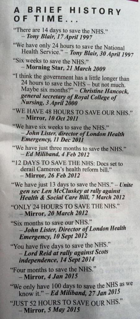 Yaaawwwwn. "It's now [$currentyear], only [$days] to save the NHS!" When you look at Labour now it brings into sharp focus just how much they mega fecked themselves when they voted in the wrong Milliband. Once Ed changed the election rules the far more left wing party membership have pretty much ensured Tory dominance for the foreseeable future.