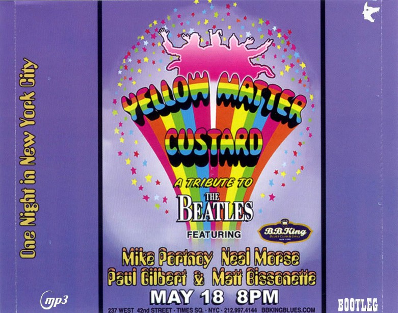 Todays first download is a rare bootleg by Yellow Matter Custard. This is the band formed by Mike Portnoy and Neal Morse with Paul Gilbert and Matt Bissonette. Mike was drummer for Dream Theatre, Neal was keyboards and vocalist with Spock's Beard, Matt was bass player with Ringo Starr and his All Starr band and Paul was founder of Racer X and Mr Big guitarist. They perform a tribute to The Beatles and it sounds absolutely fantastic. The set was recorded at B.B. Kings Club in Newyork on the 18th May 2003. Some great Beatles tracks are played - very well - and the audience love it. The bootleg ends with a few tracks recorded at the legendary Abbey Road Studio which were recorded on the 28th February 2011. This is great stuff and if you like Beatles material, this is thoroughly recommended..... Here is a download link I found for :- "One Night In New York City" BBKings Club, 237 West 42nd Street, Times Square, Newyork 18.5.03 - Yellow Matter Custard (Bootleg) Quality : Superb Tracklisting : Disc 1 : Disc 2 : Abbey Road Session 28.2.11 Because Download Links : Disc 1 : [Link] Disc 2 : [Link] Filesize : 308MB (Including Artwork and Tracklisting) The Line-up : Enjoy!