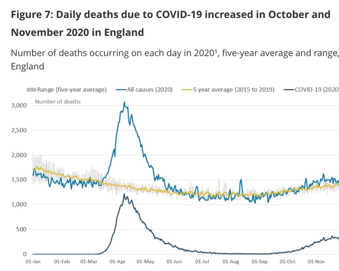 Worth a look at. But because claims the situation would be out of control without more restrictions or lockdowns there’s no stop to it. Must be said that the little compliance there was in November it was very brief. A 5 year average isn't the fairest comparison. Should really be looking a comparison between Covid19 and highest death rates over the last 50 years, trying to link it with an extraordinary event. Nothing extraordinary to produce a mass spike has happened in the last 5 years (prior to COVID).