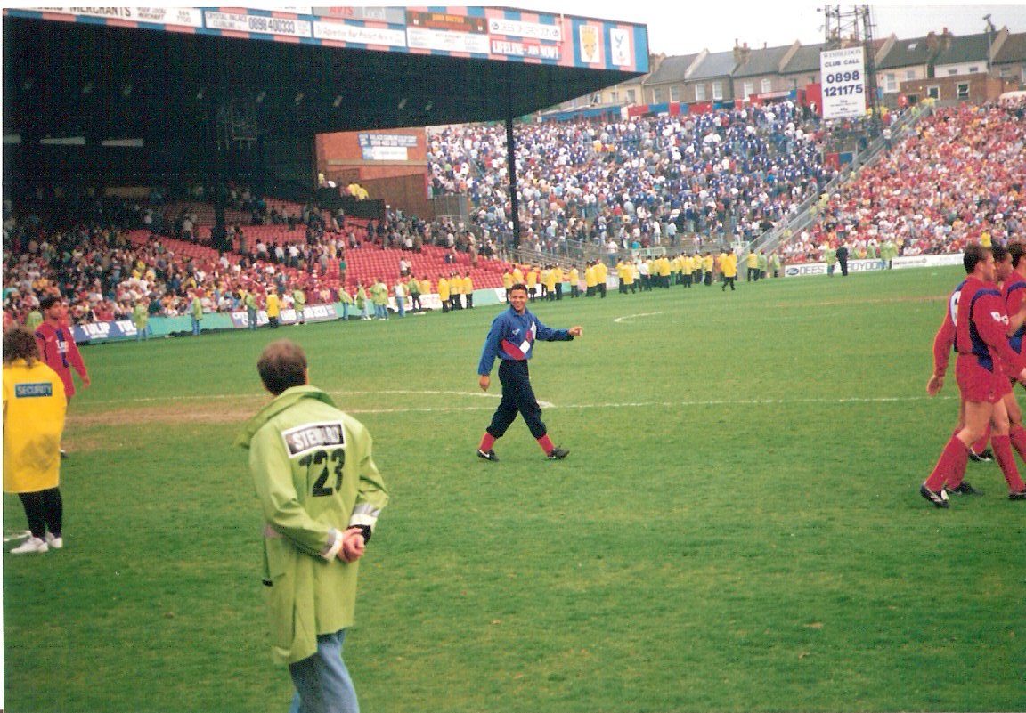 A bitter sweet day: celebrated being champions and seeing Southgate lift the cup beforehand; easily beaten by lowly Watford; but most importantly, the last day of the Holmesdale terrace. Even Ron shed a tear! The crowd was 28,694.