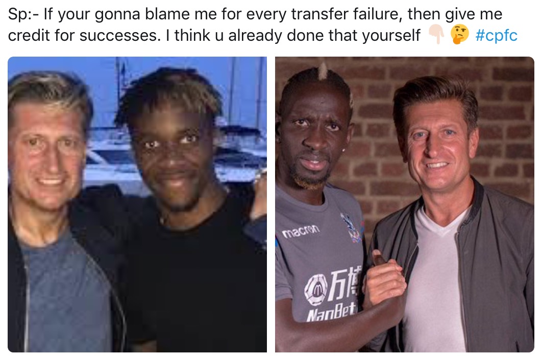 I think you are taking that a bit out of context. We was basically saying the people on Social Media that slag him off for bad signings are nowhere to be seen to praise him for the good ones. Said they ought to make up their minds as to whether he's responsible for all the signings (good or bad) or none of them. I think that is semantically different to how you've interpreted it, with respect. PTJ - look on his post when he announces Zaha and Sakho. Fans praising him. His a victim of it though with pictures of him and both signings this summer.