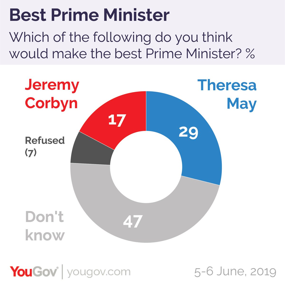 Which of the following do you think would make the best Prime Minister? Theresa May - 29% Jeremy Corbyn - 17% Don't know - 47%