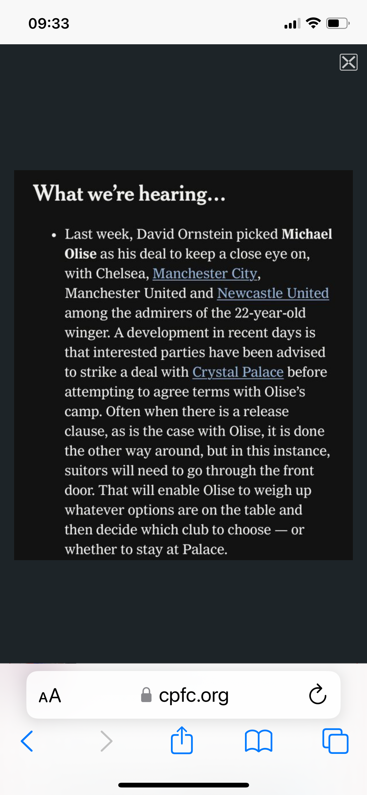 Today’s athletic has a snippet on Olise. It states clubs need to agree a deal with Palace before approaching the player. The clic bait claiming Chelsea have agreed terms are therefore complete garbage or Chelsea are tapping him up and should be reported for doing so. Edited by lefty27 (11 Jun 2024 9.32am) Tapping up probably still happens as much as ever but it seems a bit pointless when it can all be done in plain sight via online rumour sites.
